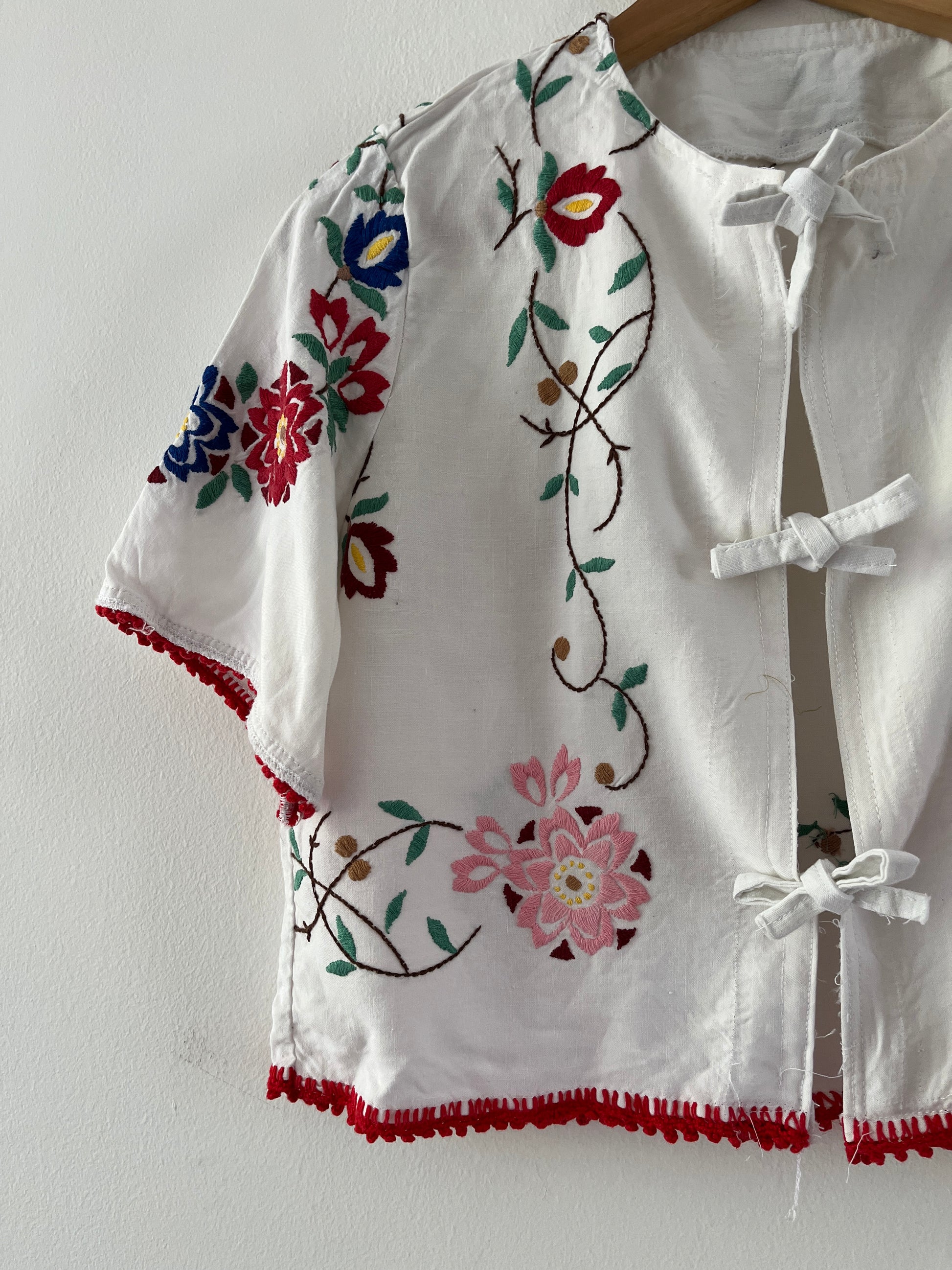 Camisa estilo box y fit con amarras de lazos. Hecha de manteles antiguos reutilizados. Talla M