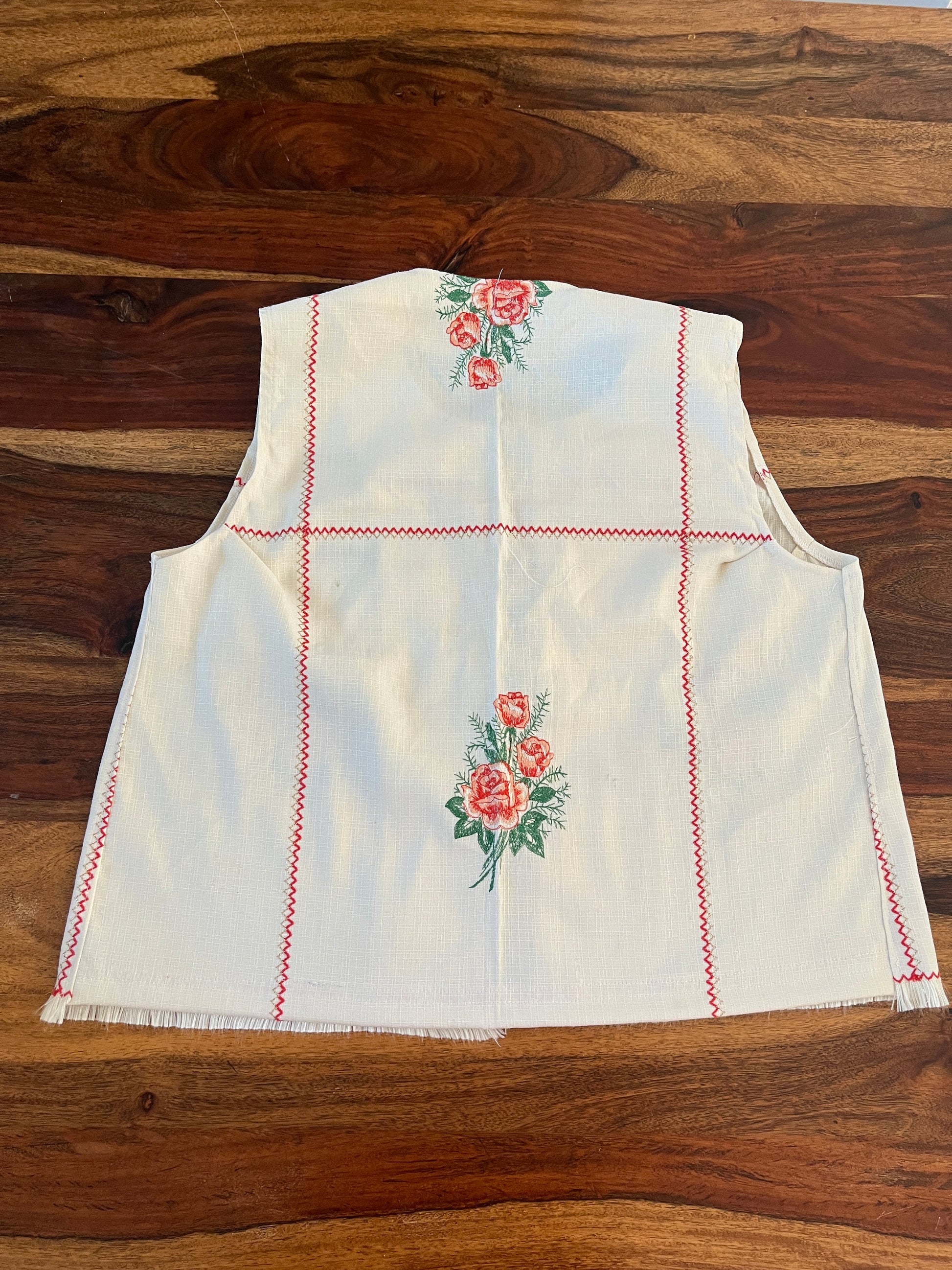 Camisa estilo box y fit con amarras de lazos y mangas globo Hecha de manteles antiguos reutilizados.