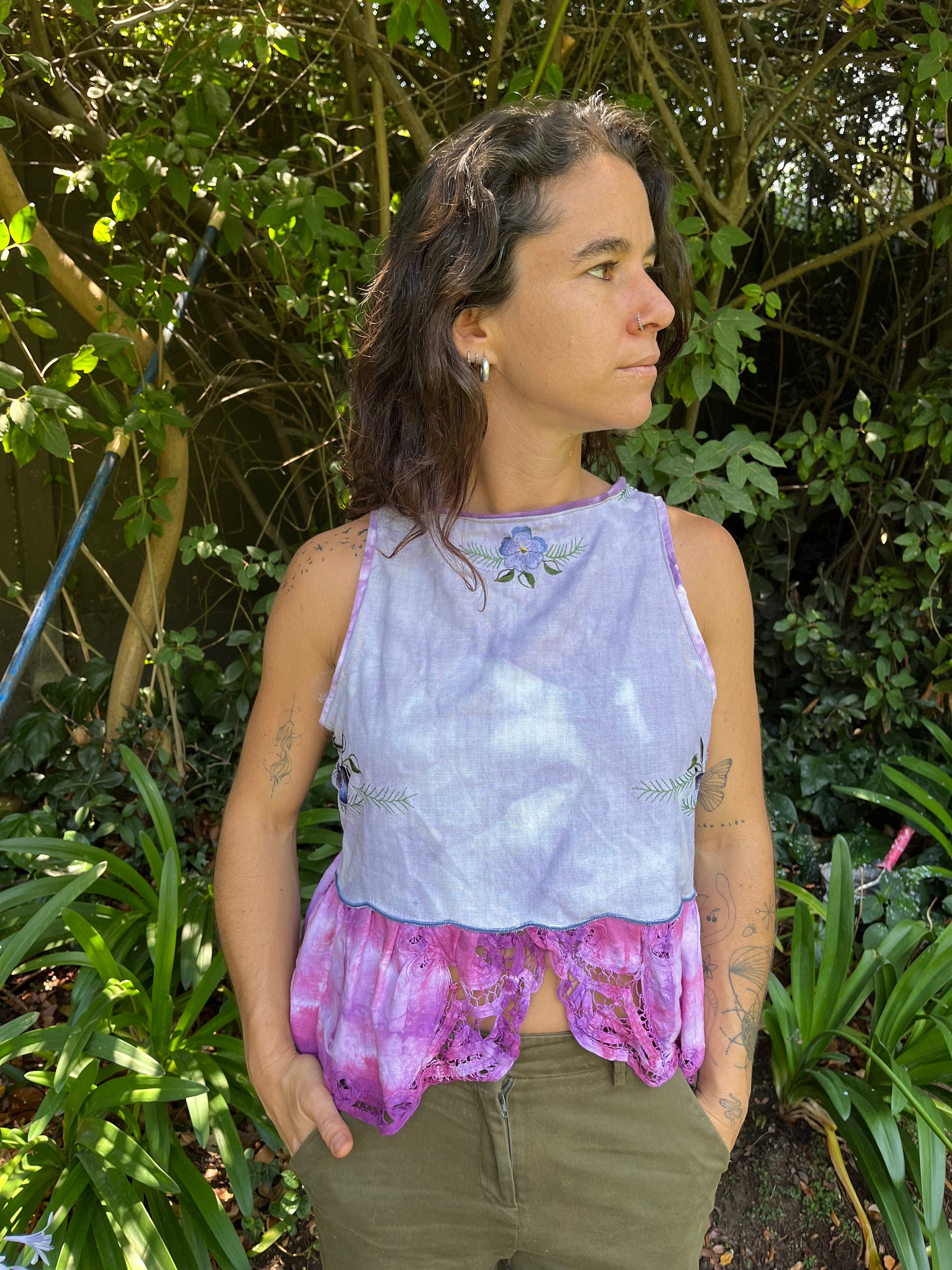 Top holgado de escote alto con flare. Hecho de manteles antiguos reutilizados. Teñidos a mano