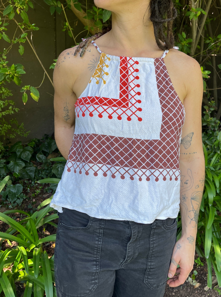 Polera de tiritas ajustables y escote alto. Hecha de un mantel vintage
