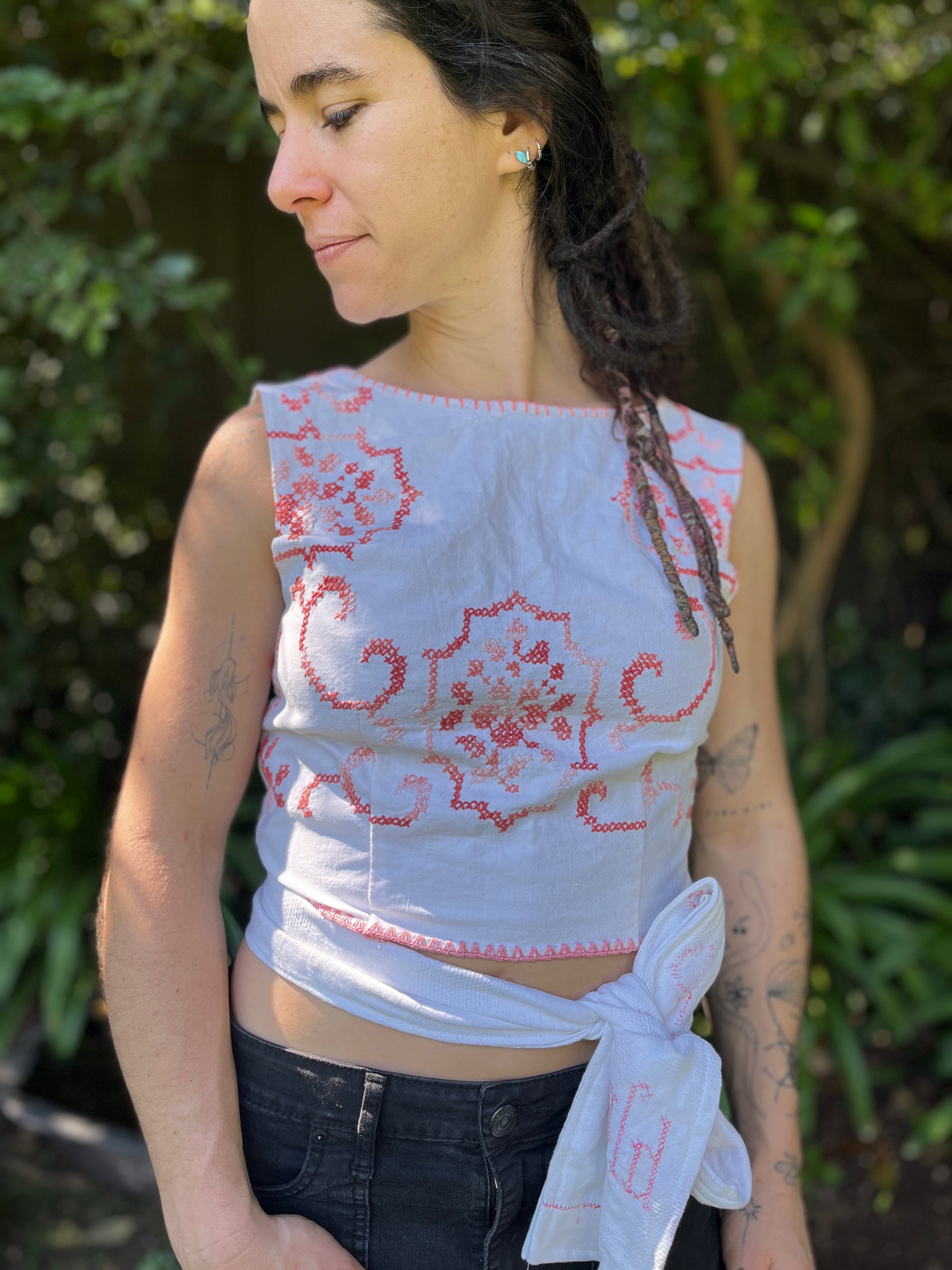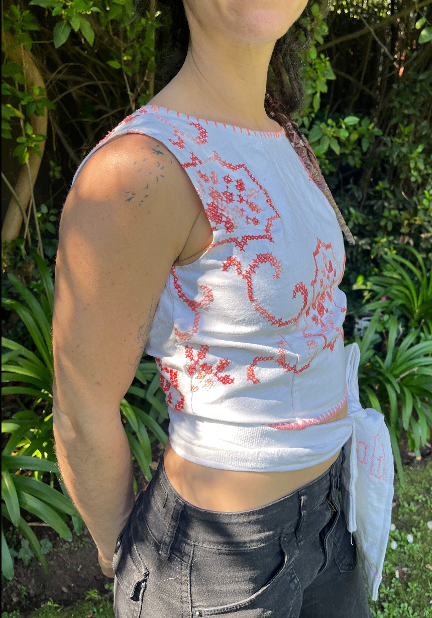 Top amarrado en la espalda , hecho de un matel vintage con aplicaciones florales en tonos claros.