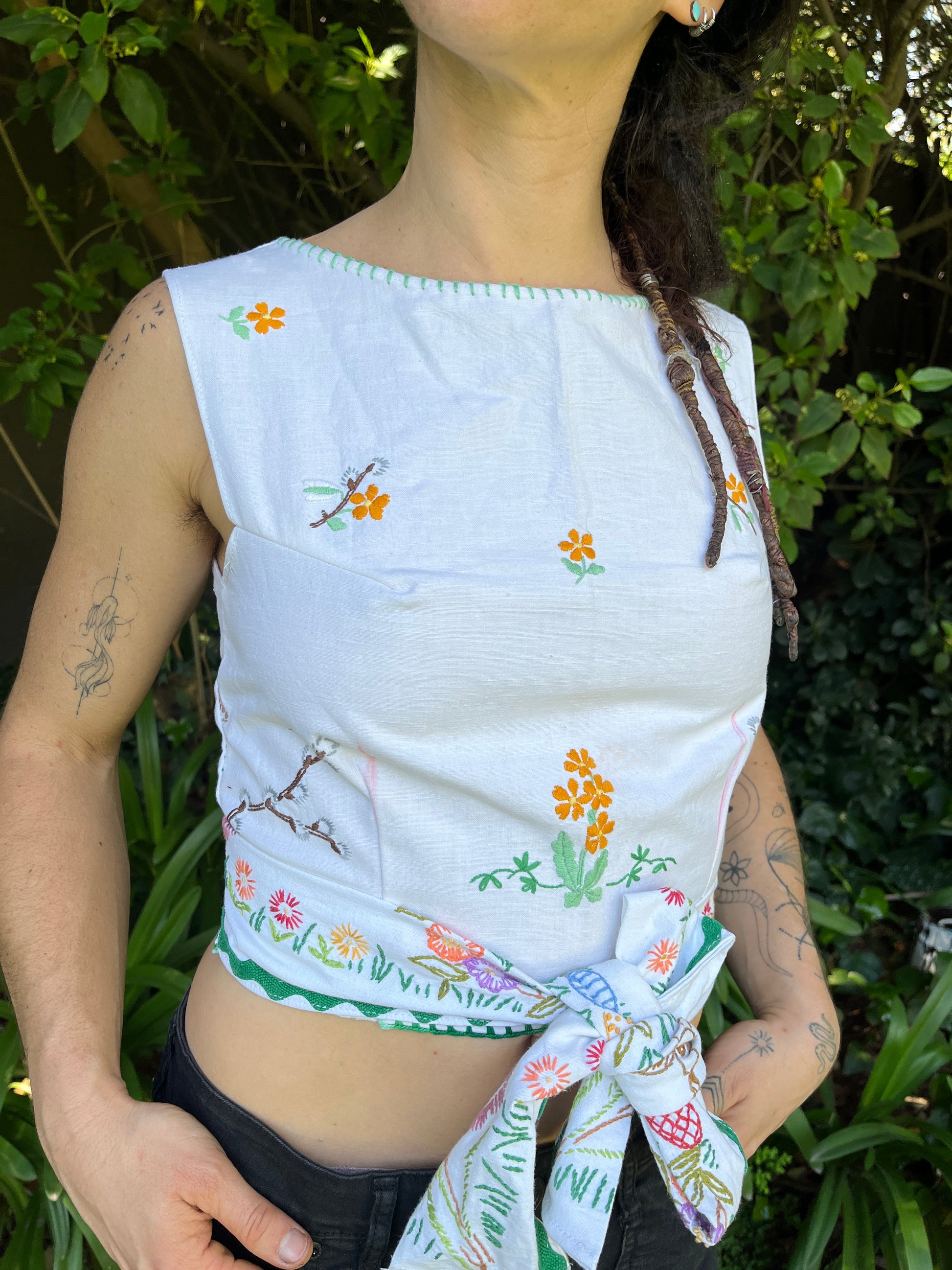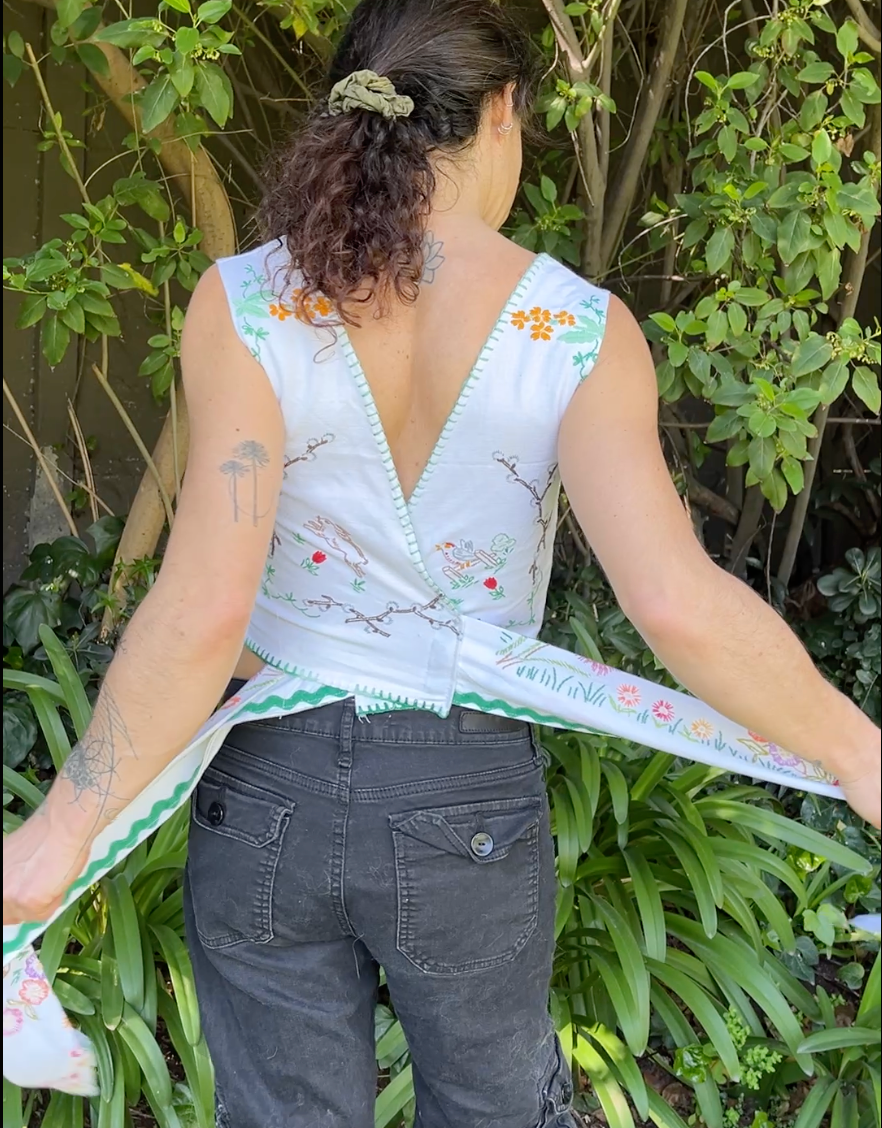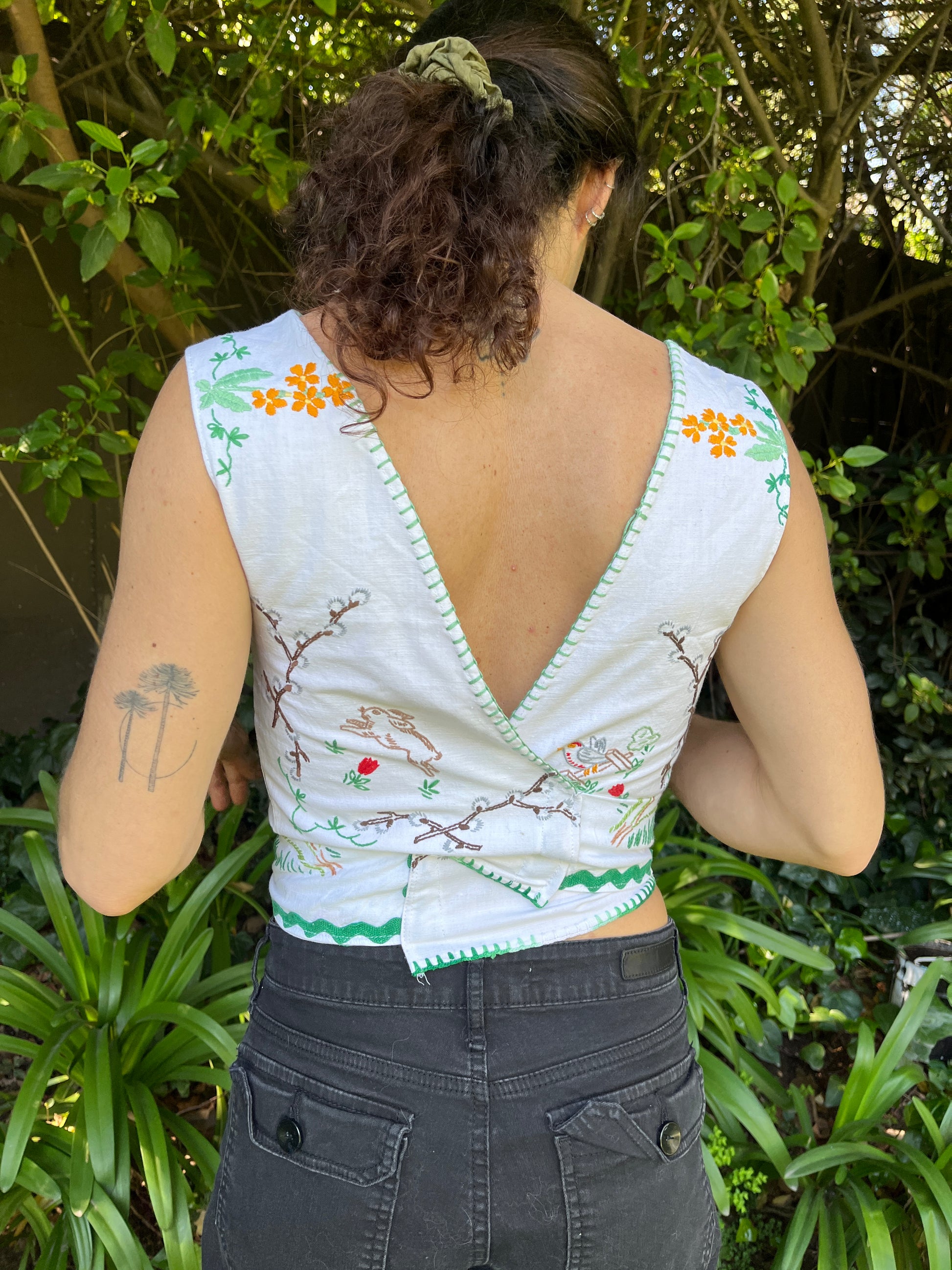 Top amarrado en la espalda , hecho de un matel vintage con aplicaciones florales en tonos claros.